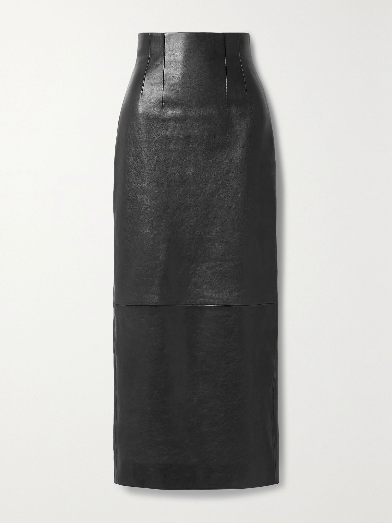 KHAITE's 'Loxley' skirt feels so refined thanks to its minimal column silhouette. As seen on the runways, this leather version has a darted waist and falls to an ankle-grazing hem that's split along the back. The smoothing crepe de chine lining stops it from clinging. Size & Fit - Fits true to size, take your normal size - Maxi-length, designed to be worn at the waist - Supple, non-stretchy leather - Model is 180cm/ 5’11” and is wearing a US 4 Details & Care - Black leather - Concealed hook and zip fastening at back - 100% leather (Lamb)