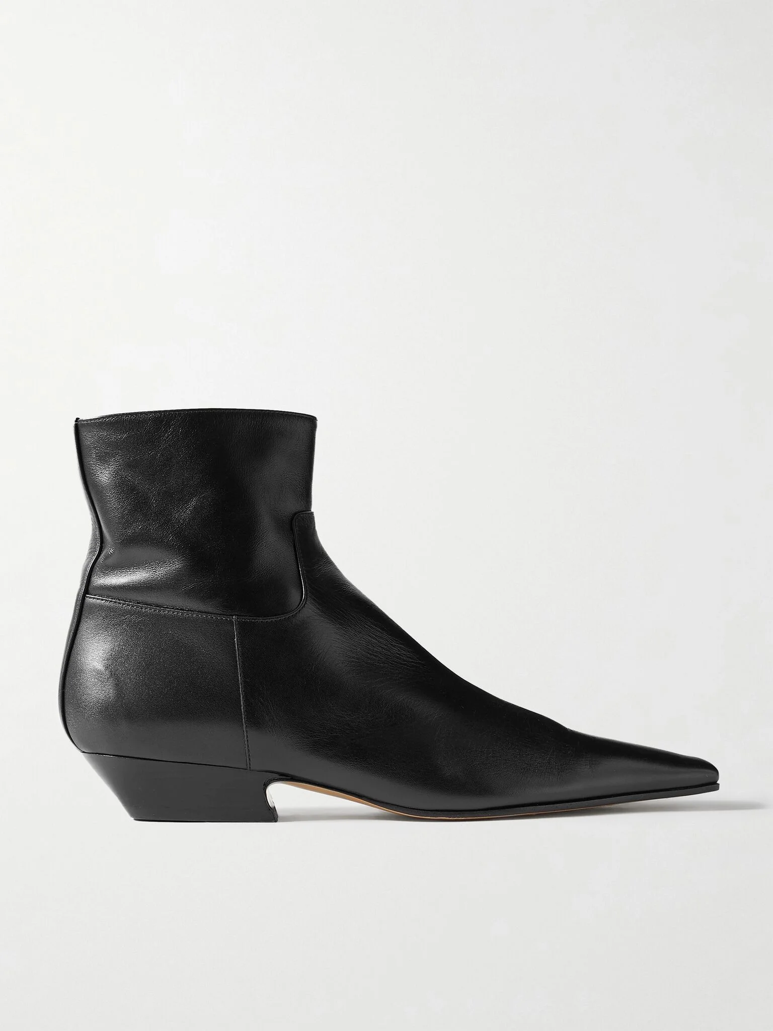 Khaite's signature 'Marfa' boots come in a variety of different shapes - this ankle version is one you'll wear on repeat through the cooler months. They're made from supple leather that'll only soften with wear and have sleek squared toes and slanted block heels. Size & Fit - Fits true to size, take your normal size - Italian sizing Details & Care - Heel measures approximately 25mm/ 1 inch - Black leather (Calf) - Zip fastening along side