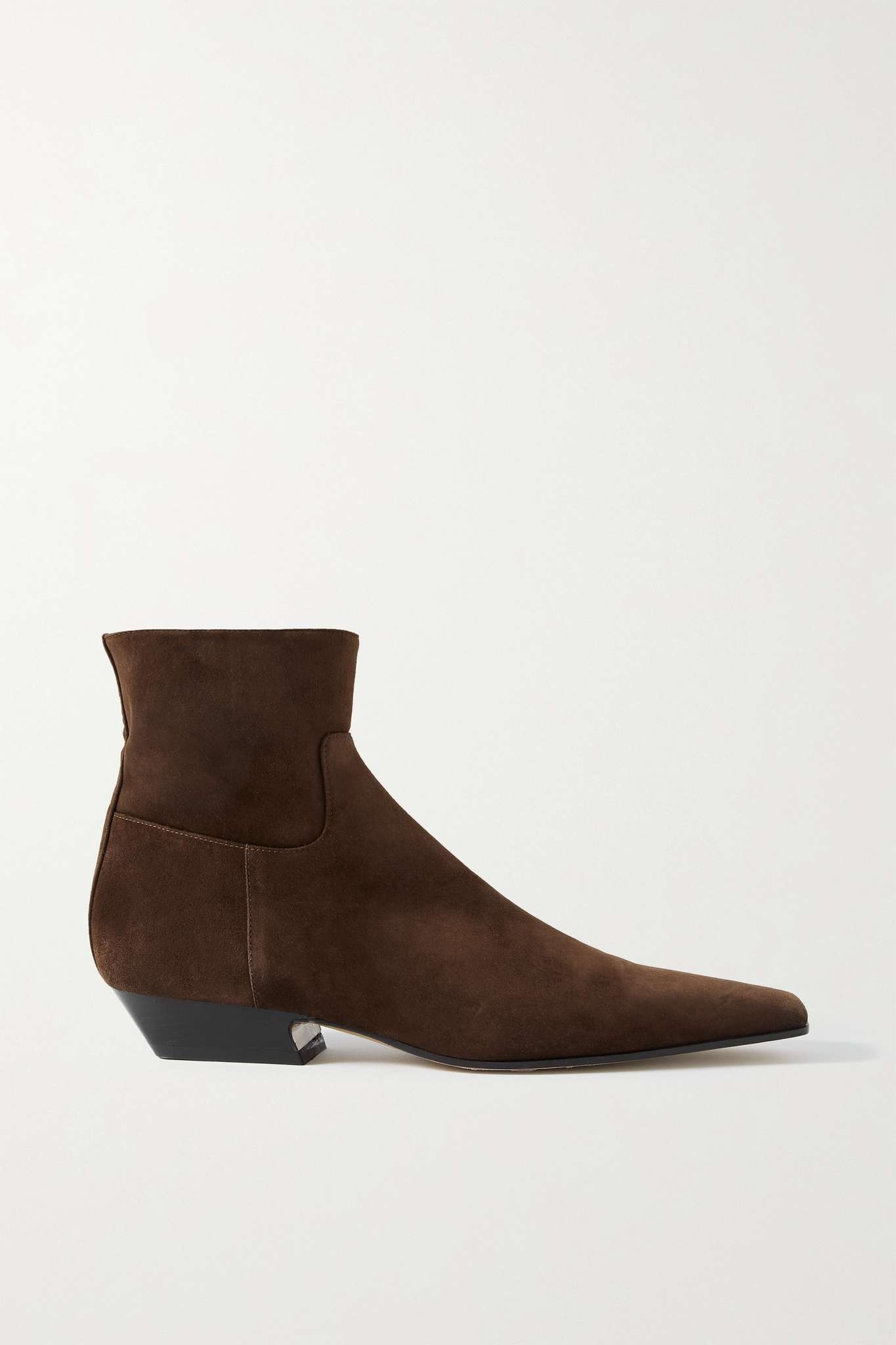 EDITORS'NOTES EXCLUSIVE AT NET-A-PORTER. Khaite's signature 'Marfa' boots come in a variety of different shapes - this ankle style is one you'll reach for on repeat through the cooler months. They're made from velvety suede that'll only soften with wear and have sleek squared toes and slanted block heels. SIZE & FIT - Fits true to size, take your normal size - Italian sizing DETAILS & CARE - Heel measures approximately 25mm/ 1 inch - Dark-brown suede (Calf) - Zip fastening along side