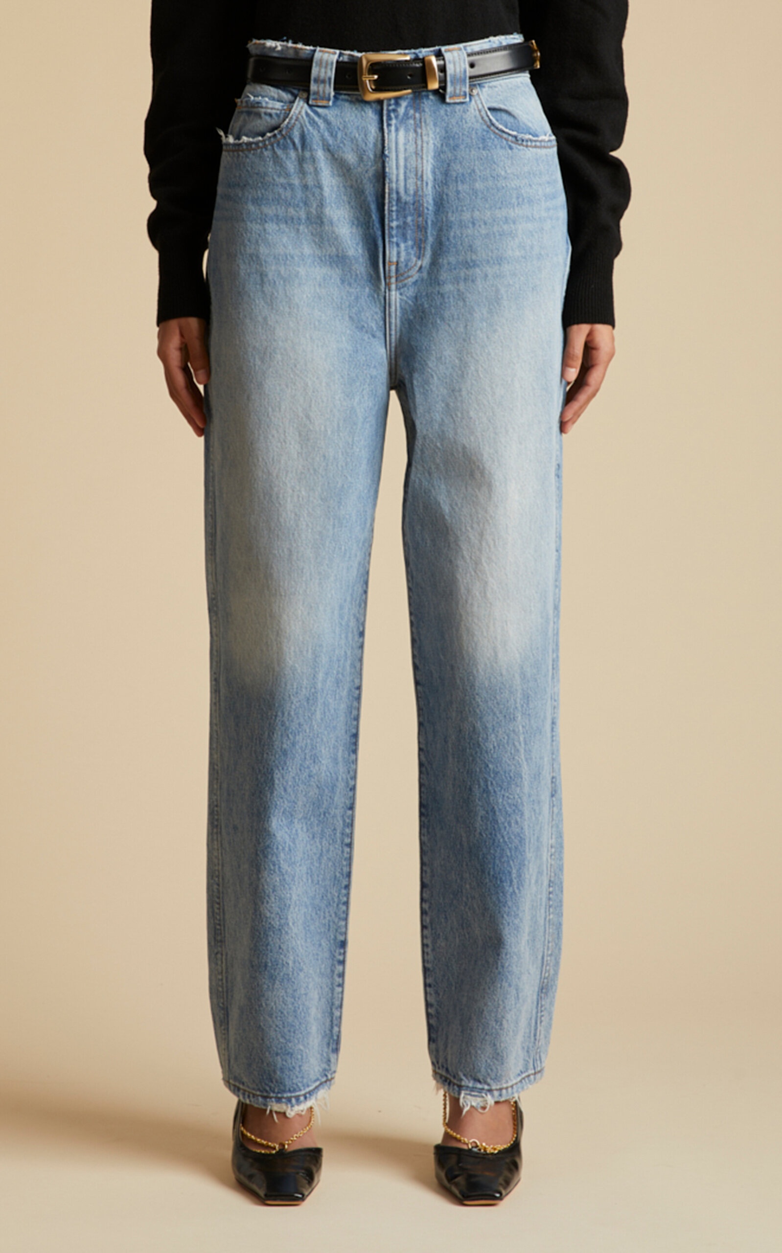 PRODUCT DETAILS - High rise, straight-cut leg, cinched in hem - Dry Clean - unlined - Composition: 100% Cotton - Color: light wash - Button and concealed zip fastening - Made in United States of America