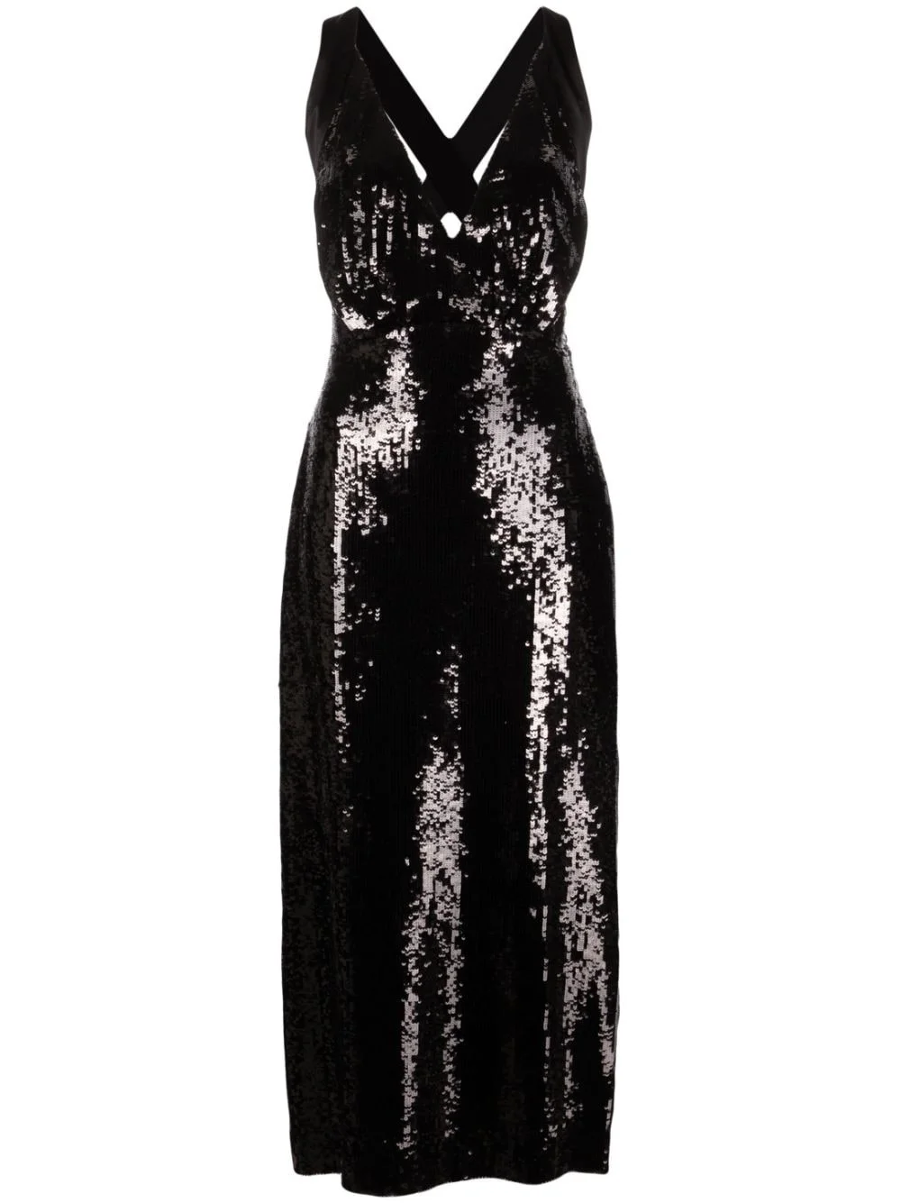 The Milo sequinned midi dress This midi dress by New York label KHAITE is illuminated with scores of shimmering black sequins. The plunging V-neck, deep side slits and open crossover back add to its statement aesthetic. Highlights - Black - Silk - Sequin embellishment - Rear criss-cross straps - V-neck - Fitted waistline - Side slit - Straight hem Made in Italy Composition Outer: Silk 100%, Viscose 100% Lining: Silk 100% SIZE & FIT Model measurements Height 5 ft 10 in(1.79 m) Bust/Chest 31.49 in(80 cm) Hips 35.03 in(89 cm) Waist 23.62 in(60 cm) FittingInformation Designed for a slim fit that sits just away from the body offering a close yet comfortable fit Made from a midweight non-stretch fabric This piece fits true to size – take your usual size Washing instructions Dry Clean Only