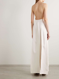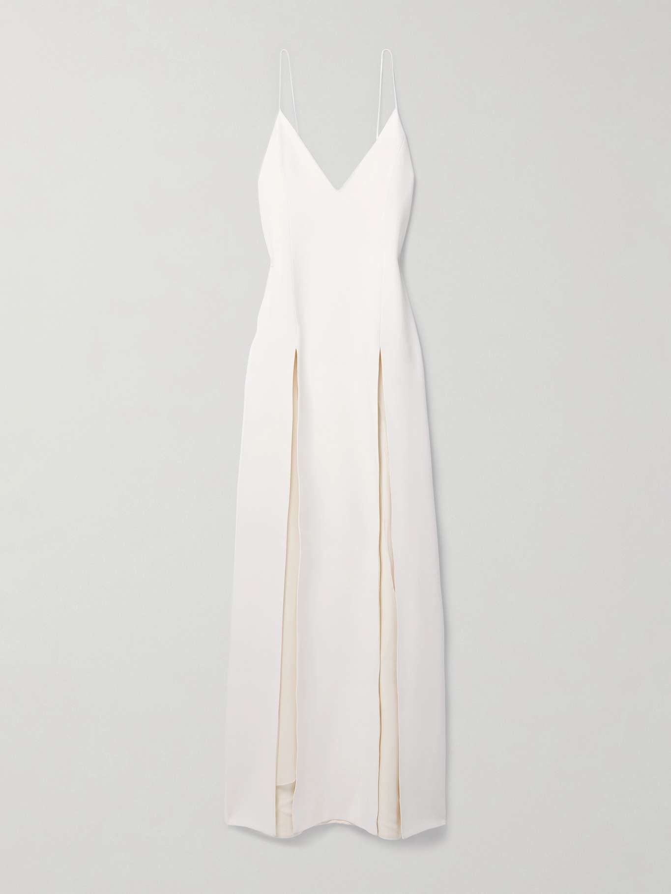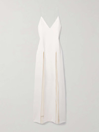 EDITORS'NOTES Khaite's 'Nonya' dress is made from white crepe and has a plunging neckline framed by pin-thin straps. The dramatic splits give the slightly loose, column silhouette movement, while showing off a flash of leg when you walk. Take cues from the label's Spring '24 runway and wear yours with gold jewelry - we have the same 'Hand' cuffs in our edit. SIZE & FIT - Fits true to size, however those who are between sizes should take the smaller size - Designed for a slightly loose fit - Lightweight, non-stretchy fabric - Model is 180cm/ 5’11” and is wearing a US 2 DETAILS & CARE - White crepe - Concealed hook and zip fastening at side - 83% acetate, 17% viscose - Designer color: Chalk