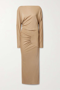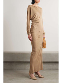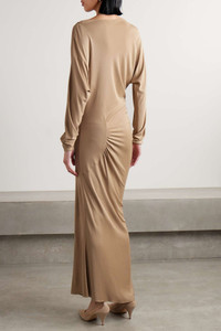 EDITORS'NOTES Khaite's founder Catherine Holstein pays close attention to fabric when designing, so you can expect this stretch-jersey 'Oron' gown to fall beautifully over your frame. Topped with an elegant bateau neckline, it's gathered along the curved seam to create a gentle ripple before falling to an ankle-grazing hem. SIZE & FIT - Fits true to size, take your normal size - Designed for a slim fit - Mid-weight, stretchy fabric - Model is 180cm/ 5’11” and is wearing a size Small DETAILS & CARE - Sand stretch-jersey - Slips on - 100% viscose