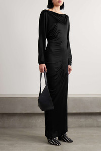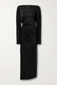 EDITORS'NOTES Khaite's founder Catherine Holstein pays close attention to fabric when designing, so you can expect this stretch-jersey 'Oron' gown to fall beautifully over your frame. Topped with an elegant bateau neckline, it's gathered along the curved seam to create a gentle ripple before falling to an ankle-grazing hem. SIZE & FIT - Fits true to size, take your normal size - Designed for a slim fit - Mid-weight, stretchy fabric - Model is 180cm/ 5’11” and is wearing a size Small DETAILS & CARE - Black stretch-jersey - Slips on - 100% viscose