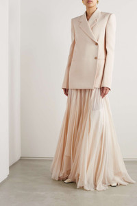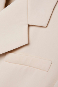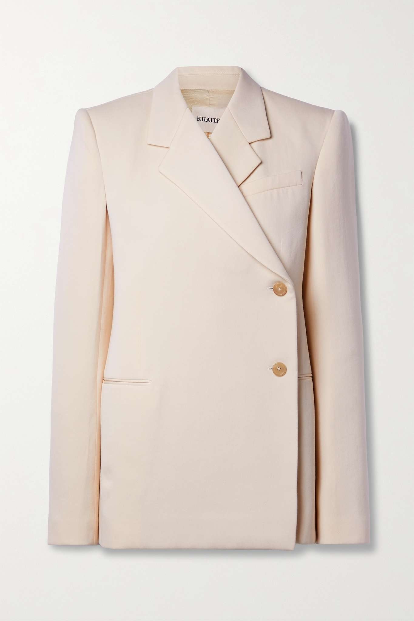EDITORS'NOTES Khaite's 'Otero' blazer is defined by its asymmetric front, which gives it a modern feel. This style is tailored from wool-blend twill in a neutral cream shade and has padded shoulders for structure. The lining allows for smooth layering. SIZE & FIT - Fits true to size, however those who are between sizes should take the smaller size - Designed for a loose fit - Mid-weight, non-stretchy fabric - Model is 180cm/ 5’11” and is wearing a US 2 DETAILS & CARE - Cream wool-blend twill - Button fastenings through front - 77% virgin wool, 23% viscose