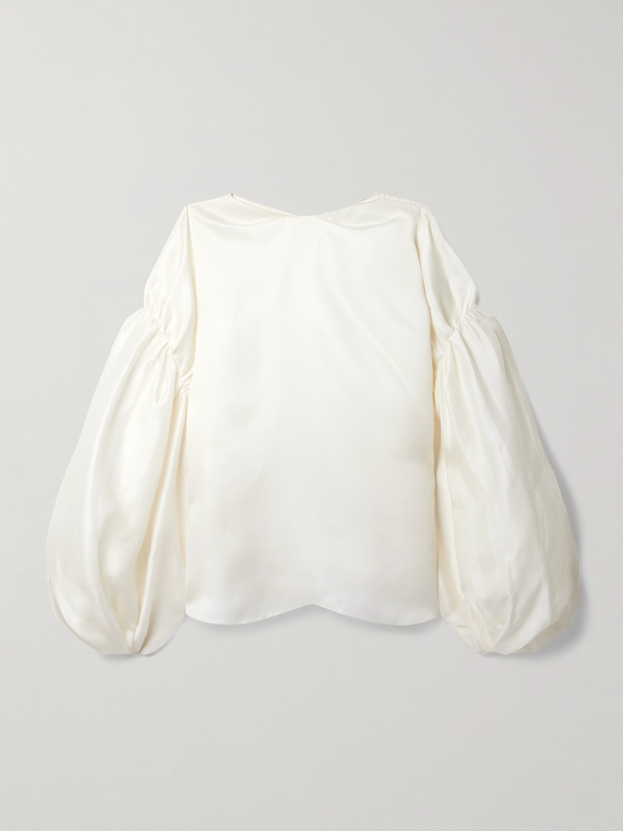 Khaite's 'Quico' blouse is designed with billowy sleeves that are gathered along the dramatically dropped shoulder seam to further enhance the volume. It's made from lustrous silk for an oversized fit. Tuck yours into slim tailoring to match the Spring '24 show styling.