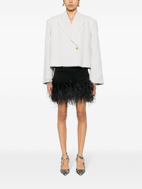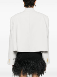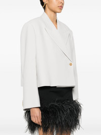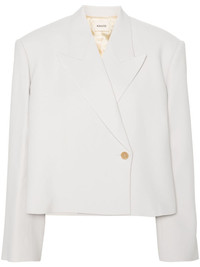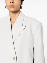 The Raymond jacket KHAITE draws from the fearless spirit of New York City dwellers to inspire The Raymond jacket. A play on proportion, it’s tailored to a cropped swing silhouette with round padded shoulders to balance the boxy cut and wide peak lapels. Highlights - Ash grey - Crepe texture - Horn-effect buttons - Wide peak lapels - Shoulder pads - Long sleeves - Buttoned cuffs - Cropped - Multiple internal slip pockets - Full satin lining - Double-breasted button fastening Made in United States Composition Outer: Acetate 83%, Viscose 17% Lining: Cupro 100% SIZE & FIT Model measurements Height 5 ft 9 in(1.76 m) Bust/Chest 31.88 in(81 cm) Hips 35.43 in(90 cm) Waist 24.8 in(63 cm) FittingInformation Designed for a boxy fit, intended for a loose fit throughout The internal shoulder pads offer a structured shape Made from a midweight non-stretch fabric This piece fits large – take one size down. If you have petite frame you may wish to take a further size down Washing instructions Dry Clean Only