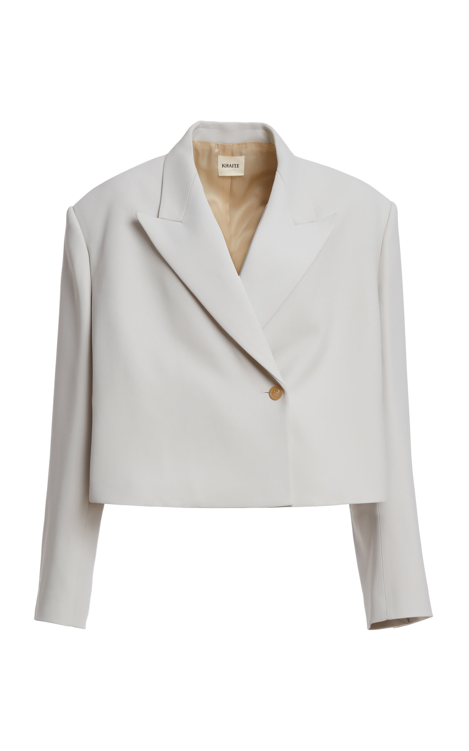 PRODUCT DETAILS - Boxy fit, peaked lapels, double breasted - Dry clean only - Unlined - Composition: 83% Acetate, 17% Viscose - Color: black - Button fastening along front - Made in United States of America