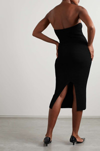 EDITORS'NOTES Khaite's otherwise simple 'Rumer' dress is defined by the strapless, curved neckline with contouring seams through the cups. It's cut for a slim fit with a midi length hem and back split for ease of movement. Dress it up with simple heels or add sneakers and a jacket for a casual take. SIZE & FIT - Fits true to size, take your normal size - Intended for a close fit - Lightweight knit - Model is 180cm/ 5’11” and is wearing a size Medium DETAILS & CARE - Black ribbed-knit - Slips on - 83% viscose, 17% polyester