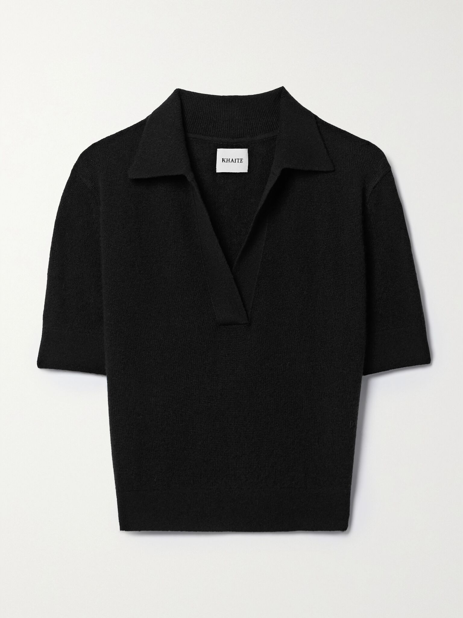 Khaite's polo shirt really delivers on comfort and style. It's knitted from exceptionally soft cashmere blended with stretch and has ribbed trims. Team it with everything from relaxed tailoring to your favorite jeans. Size & Fit - Fits true to size, take your normal size - Designed for a slightly loose fit - Lightweight knit - Model is 177cm/ 5'10" and is wearing a size Small Details & Care - Black cashmere-blend - Slips on - 95% cashmere, 5% elastane - Dry clean
