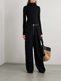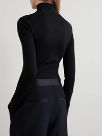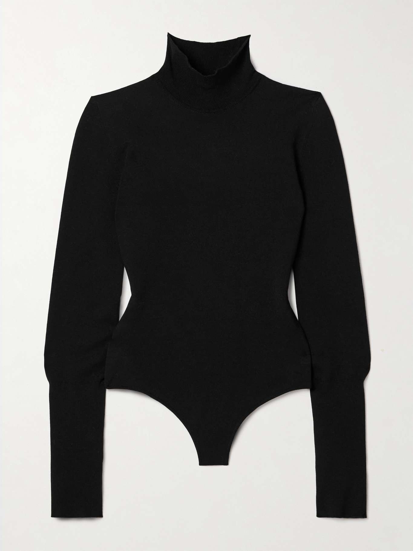 EDITORS'NOTES KHAITE's 'Thea' turtleneck bodysuit will be build the foundation for so many outfits - style it solo with tailoring, under blazers with jeans or for a seamlessly tucked look with a midi skirt. Made from wool-blend jersey, it’s cut for a body-skimming figure and has a thong base that prevents unwanted lines. SIZE & FIT - Fits true to size, take your normal size - Those with a long torso may wish to take the next size up - Designed for a very close fit - Fine knit - Model is 180cm/ 5'11" and is wearing a size Small DETAILS & CARE - Black wool-blend jersey - Snap fastenings at base - 73% wool, 25% polyamide, 2% polyurethane