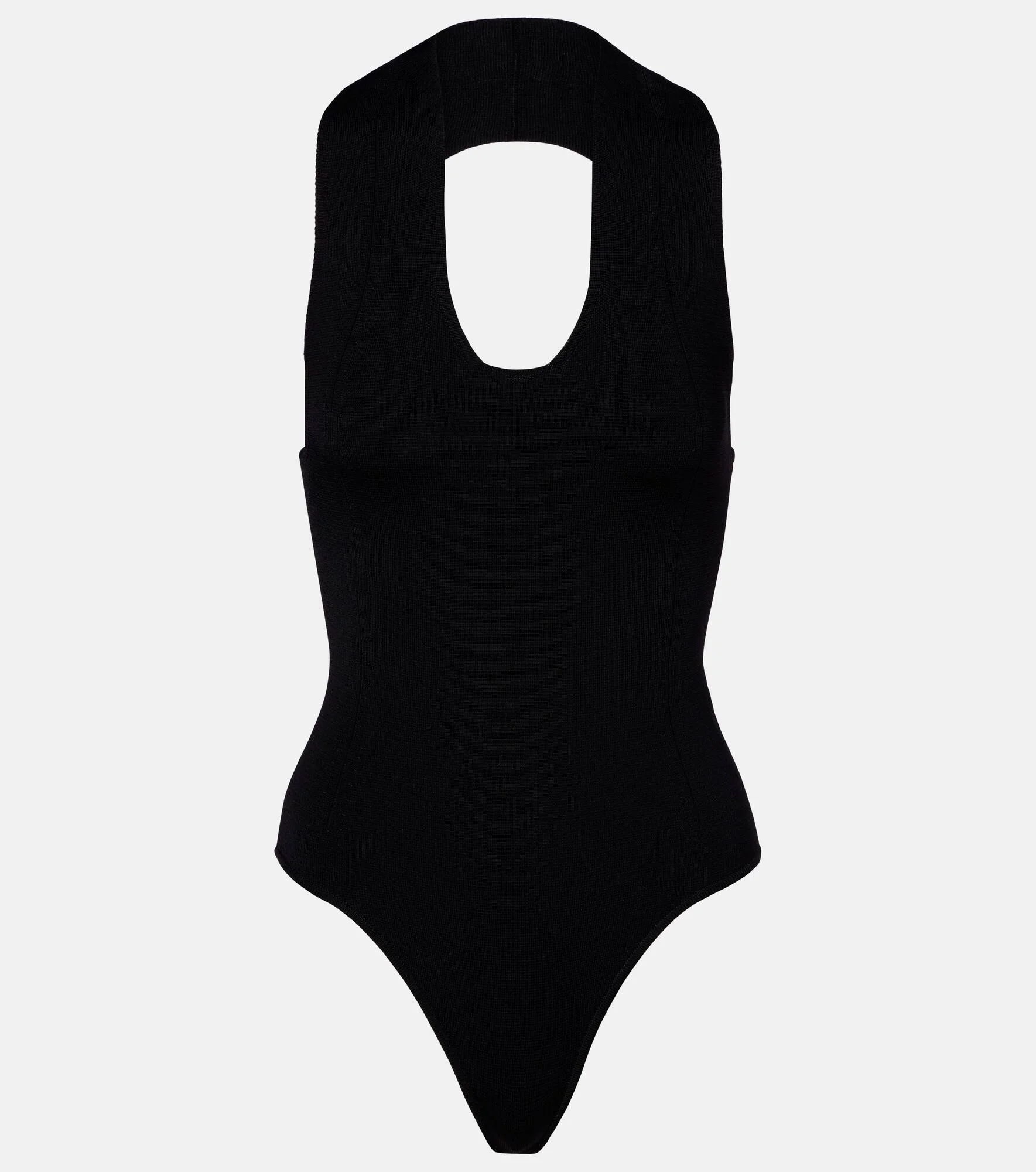The Toto bodysuit from Khaite is designed with a halterneck and a deep neckline. The black style features an open back and practical snap button fastenings. Product Details - Material: 69% viscose, 28% polyamide, 3% elastane - Care instructions: dry clean - Made in Italy - Color: black - Designer color name: Black - Item number: P01145718 Size & Fit - True to size - Low back - Fitted - Stretchy fabric - High-cut leg - The model seen in the picture is 178cm-5'10" and wearing a size XS