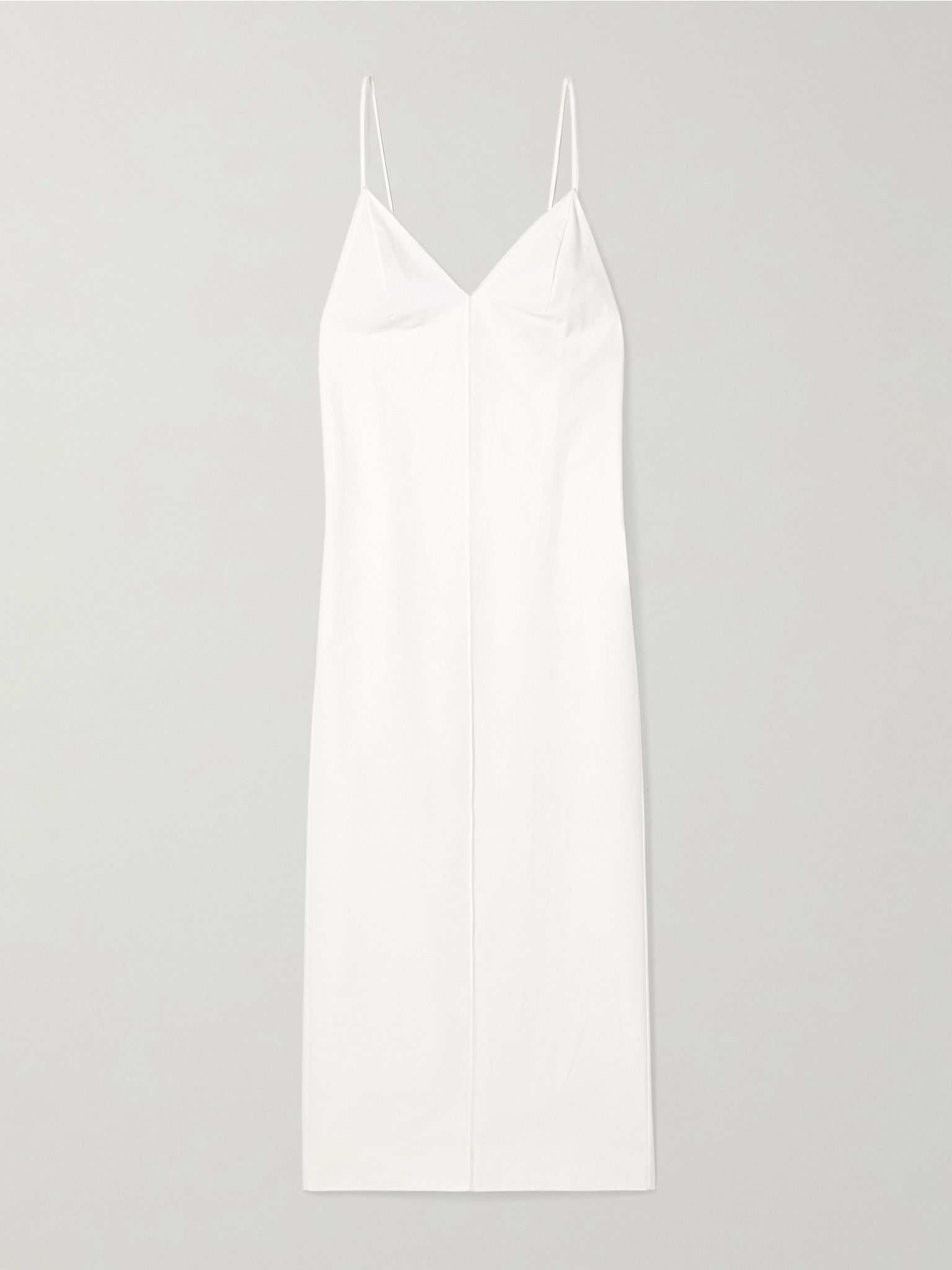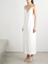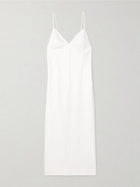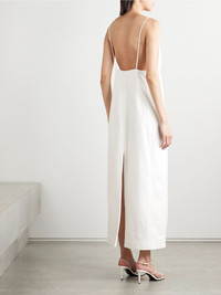 The beauty of KHAITE's 'Tulula' dress lies in its simplicity. It's made from crisp silk-poplin and has a dramatic split at the back. The V-neckline is framed by thin straps and a low, skin-baring back. Size & Fit - Fits true to size, take your normal size - Designed for a loose fit - Lightweight, non-stretchy fabric - Model is 180cm/ 5’11” and is wearing a size Small Model measurements: - Bust: 79cm/ 31” - Waist: 61cm/ 24” - Hip: 89cm/ 35” Details & Care - White silk-poplin - Slips on - 100% silk