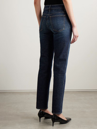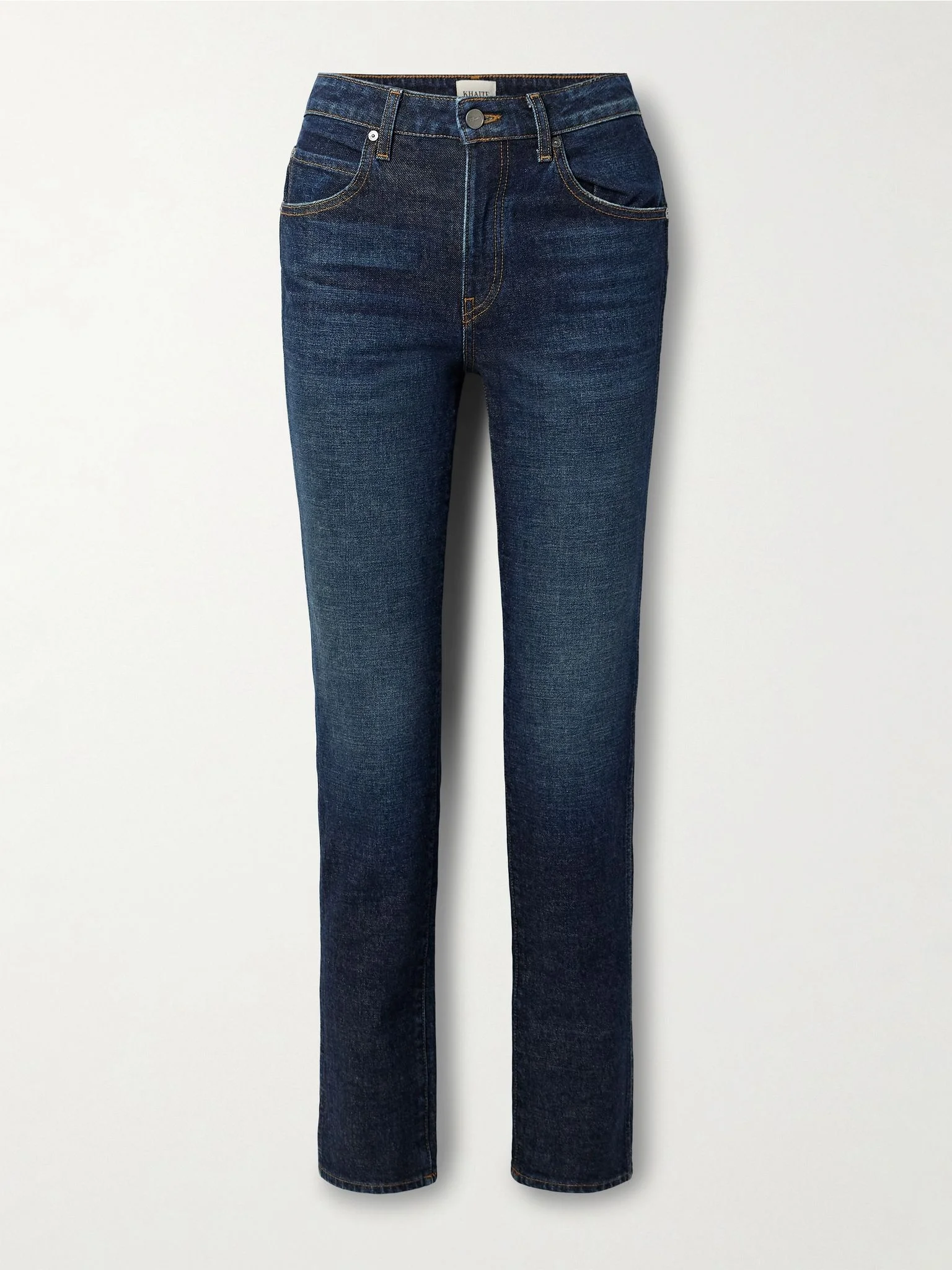 KHAITE's slim-leg 'Viv' jeans are a classic pair you'll return to for seasons to come. Made from faded denim, they have a high rise and five pockets outlined in gold thread. Style them with everything from sweaters to blazers. Size & Fit - Fits true to size, take your normal size - High-rise, cut for a slim fit - Mid-weight, non-stretchy fabric - Model is 180cm/ 5'11" and is wearing a size 26 Model measurements: - Bust: 79cm/ 31" - Waist: 61cm/ 24" - Hip: 89cm/ 35" Details & Care - Dark-blue denim - Button and concealed zip fastening at front - 98% cotton, 2% polyurethane - Designer wash: Lansing