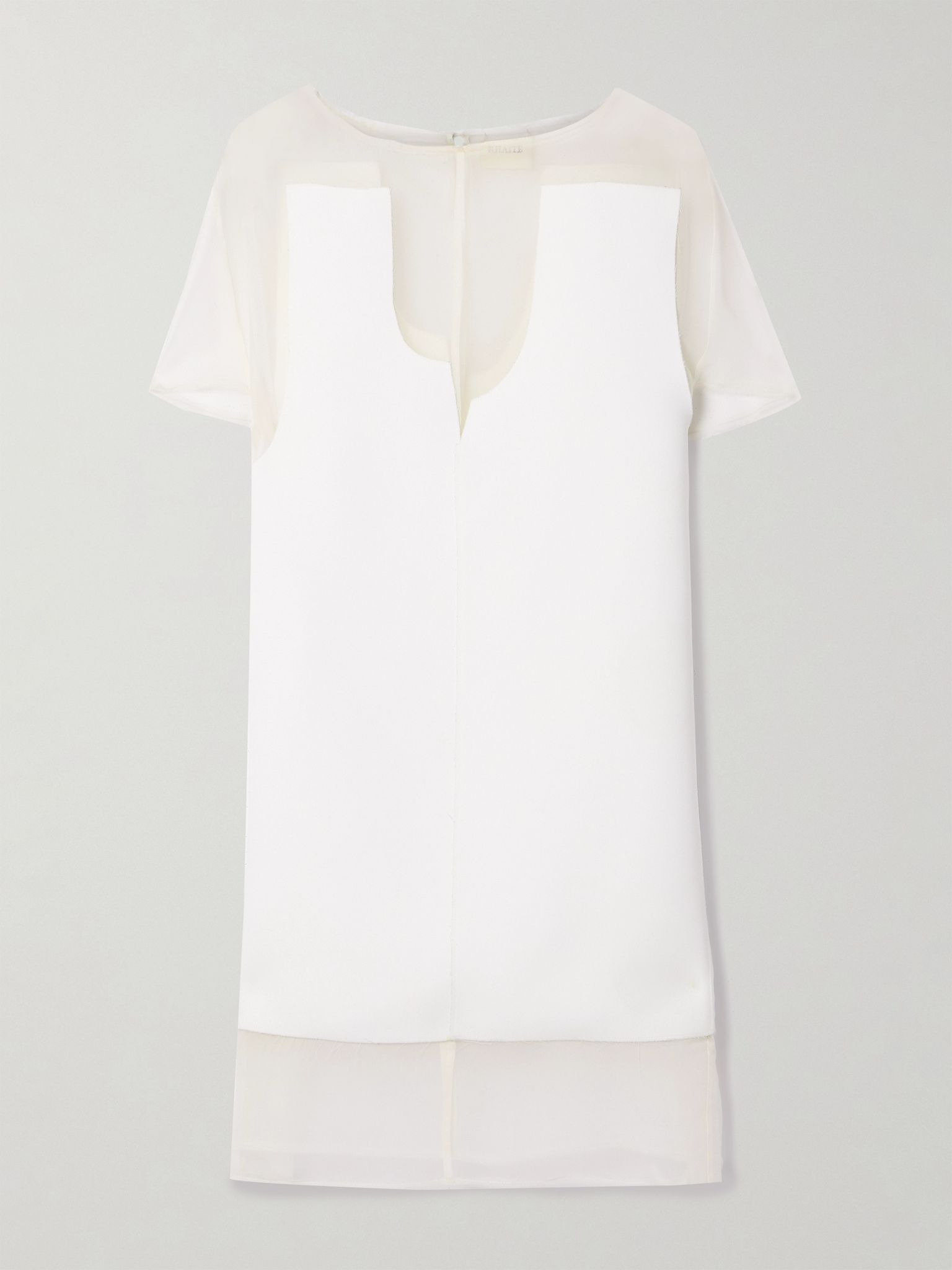 KHAITE's 'Winona' mini dress debuted on the Spring '25 runway, where it was styled with the 'Trenton' pants in our edit. It's made from panels of opaque crepe and sheer chiffon that offer coverage where you need it. Wear yours with delicate jewelry and natural, dewy makeup. Size & Fit - Fits true to size, take your normal size - Designed for a loose fit - Mid-weight, non-stretchy fabric - Model is 180cm/ 5'11" and is wearing a size Small Details & Care - White crepe, cream chiffon - Button-fastening keyhole at back - 100% polyester