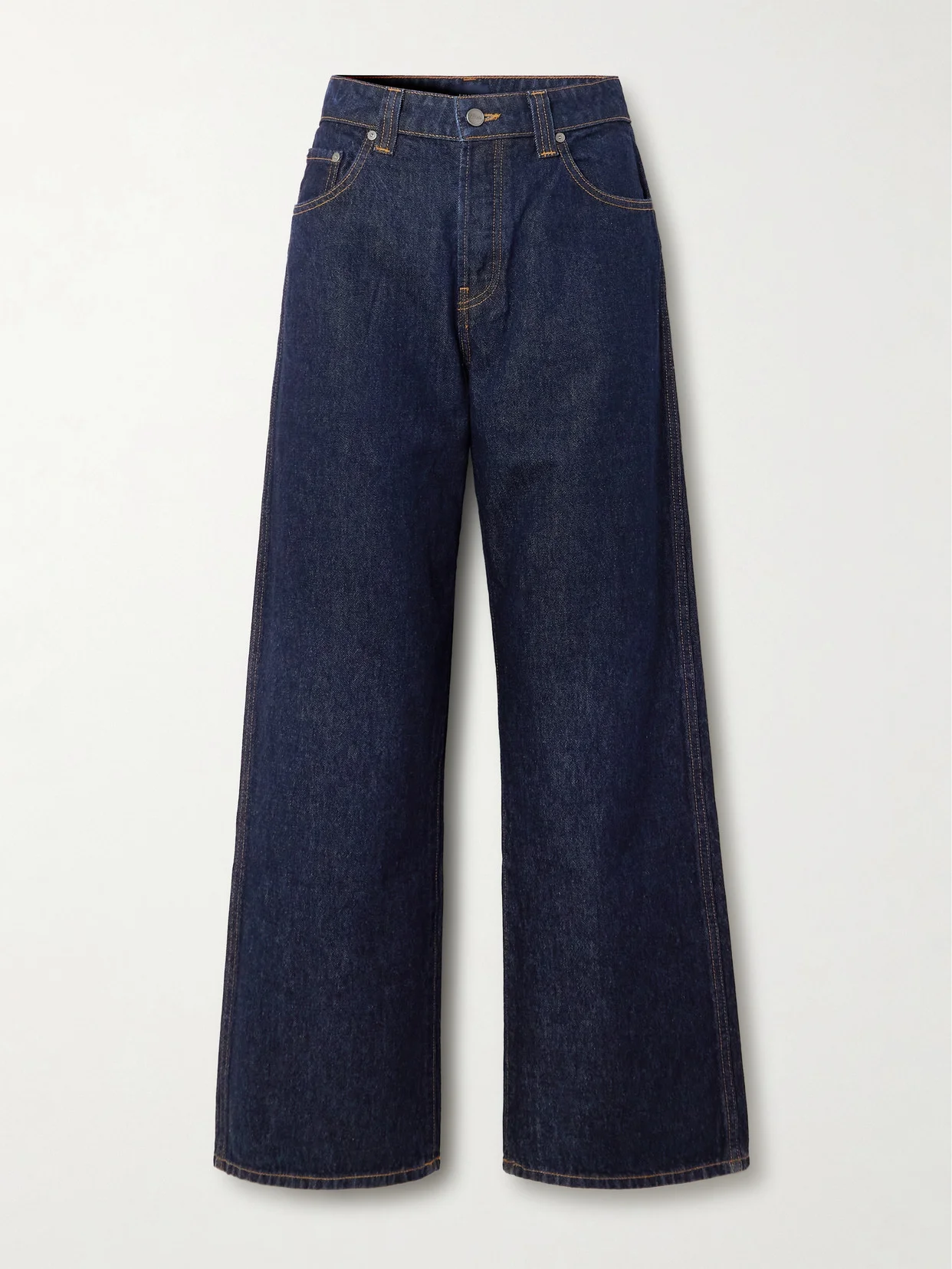 KHAITE's 'Winslow' jeans have a mid-rise waist and wide-leg cut, best styled with a fitted or tucked-in top. They're made from structured denim in a dark 'Benson' wash.