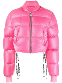 cropped puffer jacket bubblegum pink padded panels stand-up collar long sleeves ribbed cuffs front zip fastening front flap pockets silver-plated hardware drawstring hem Made in Italy Composition Outer: Polyamide 100% Lining: Polyamide 100%, Polyester 100%, Down 90%, Feather 10% SIZE & FIT Model measurements Height 5 ft 10 in(1.78 m) Bust/Chest 30.31 in(77 cm) Hips 36.61 in(93 cm) Waist 24.8 in(63 cm) FittingInformation This piece fits true to size. We recommend you get your regular size Cut for a slim fit Made with a mid-weight non-stretch fabric Washing instructions Hand Wash