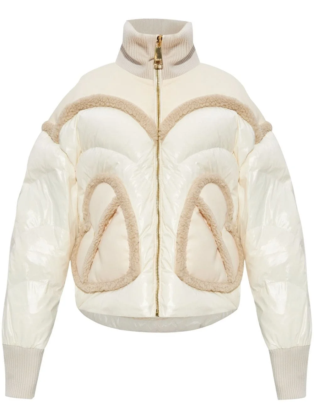 down padded jacket Highlights - Beige - Quilted panels - Front zip fastening - High neck - Long sleeves - Elasticated cuffs - Two side stud-fastening pockets Made in Italy Composition Outer: Polyamide 100%, Polyester 100%, Wool 100%, Polyurethane 100% Lining: Down 80%, Feather 20%