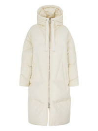 hooded zip-fastening coat Highlights - Beige - Hood - Zip fastening - Side pockets - Down filled - Embossed logo lettering Made in Italy Composition Outer: Polyester 88%, Polyurethane 12% Lining: Down 100% Washing instructions Read Manufacturer Guidelines