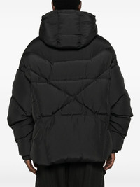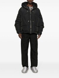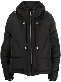 hooded zip-up padded jacket Highlights - Black - Down-feather filling - Padded design - Press-stud fastening - Front zip fastening - Drawstring hood - Long sleeves - Straight hem Made in Italy Composition Lining: Polyester 100%, Down 80%, Feather 20% Outer: Polyester 100% SIZE & FIT Model measurements Height 5 ft 10 in(1.77 m) Bust/Chest 32.28 in(82 cm) Hips 35.03 in(89 cm) Waist 25.19 in(64 cm) FittingInformation Designed to be unstructured, offering a loose fit throughout The internal drawstring at the hem allows for fitted preferences Made from a padded non-stretch fabric, giving it no natural elasticity This piece fits true to size – take your usual size Washing instructions Hand Wash