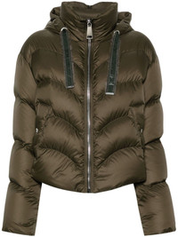 Hug puffer jacket Highlights - Ivy green - Down-feather filling - Padded design - Quilted - Front zip fastening - Branded zip puller - Drawstring hood - Jacquard logo motif at the drawstring - Drop shoulder - Long sleeves - Elasticated cuffs - Two front welt pockets - Full lining - Drawstring hem with toggle fastening Made In Italy Composition Polyester 100%, Polyamide 100%, Duck Down 80%, Duck Feathers 20% SIZE & FIT Model measurements Height 5 ft 10 in(1.78 m) Bust/Chest 32.67 in(83 cm) Hips 35.43 in(90 cm) Waist 23.22 in(59 cm) FittingInformation Designed to be unstructured, offering a loose fit throughout The internal drawstring at the hem allows for fitted preferences Made from a padded non-stretch fabric, giving it no natural elasticity