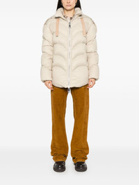 Hug puffer jacket Highlights - Sand beige - Front zip fastening - Drawstring hood - Two side welt pockets - Quilted Made in Italy Composition Lining: Polyester 100%, Duck Down 80%, Duck Feathers 20% Outer: Polyamide 100% SIZE & FIT Model measurements Height 5 ft 11 in(1.8 m) Bust/Chest 33.07 in(84 cm) Hips 37.4 in(95 cm) Waist 25.19 in(64 cm) FittingInformation Designed for a relaxed fit, this piece allows for comfort and movement when worn The internal drawstring at the hem allows for fitted preferences Made from a padded non-stretch fabric, giving it no natural elasticity
