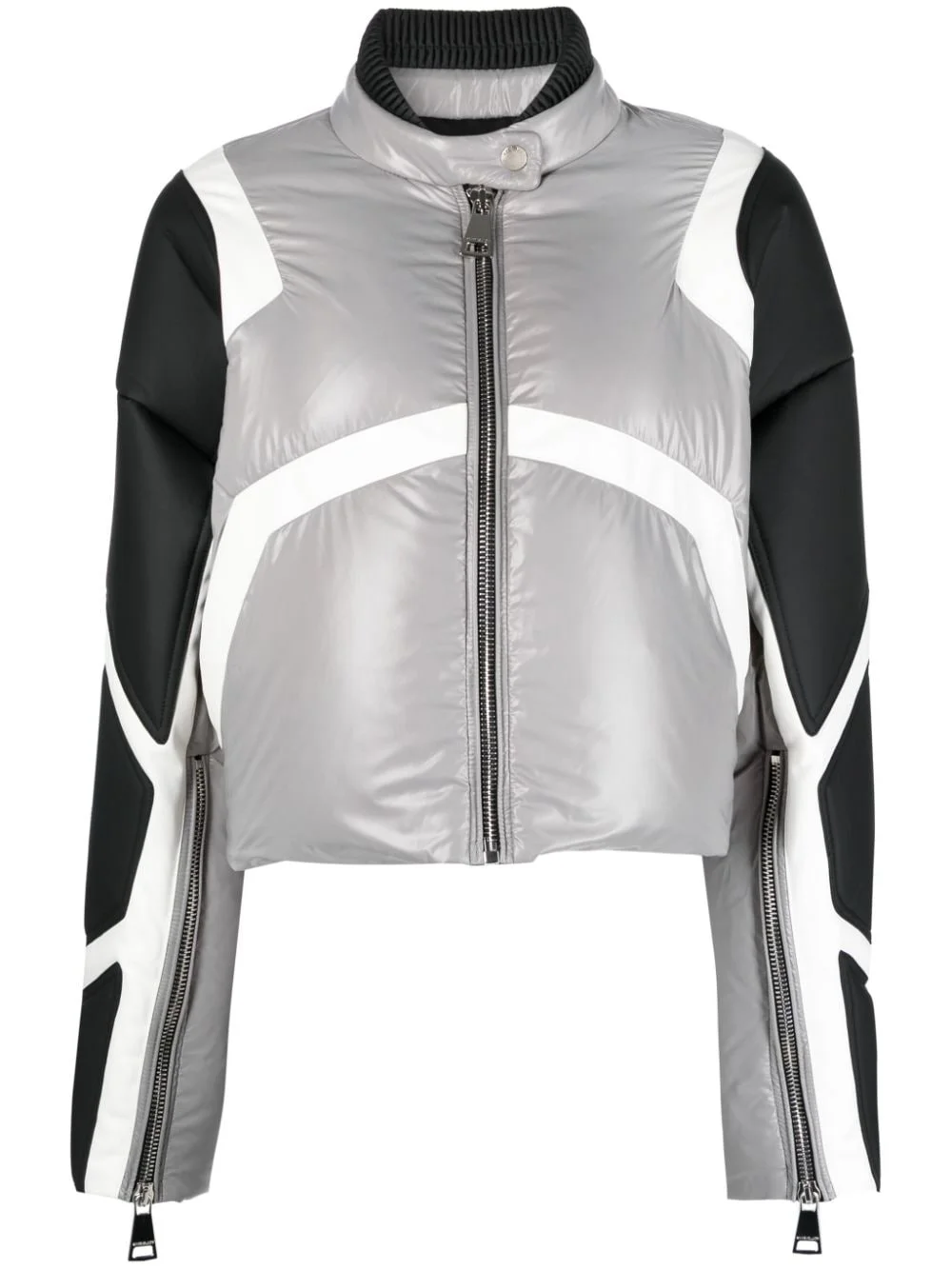 Khris Crop Biker puffer jacket Highlights - Black/grey/white - Feather down - Panelled design - Padded design - Band collar - Front zip fastening - Long sleeves - Cuff zips - Cropped - Straight hem Made in Italy Composition Outer: Polyamide 100%, Acrylic 52%, Polyester 43%, Polyurethane 5% Lining: Polyester 100%, Feather Down 100% SIZE & FIT Model measurements Height 5 ft 10 in(1.79 m) Bust/Chest 32.67 in(83 cm) Hips 34.25 in(87 cm) Waist 24.4 in(62 cm) FittingInformation Designed to be unstructured, offering a loose fit throughout The internal drawstring at the hem allows for fitted preferences Made from a padded non-stretch fabric, giving it no natural elasticity This piece fits true to size – take your usual size Washing instructions Hand Wash