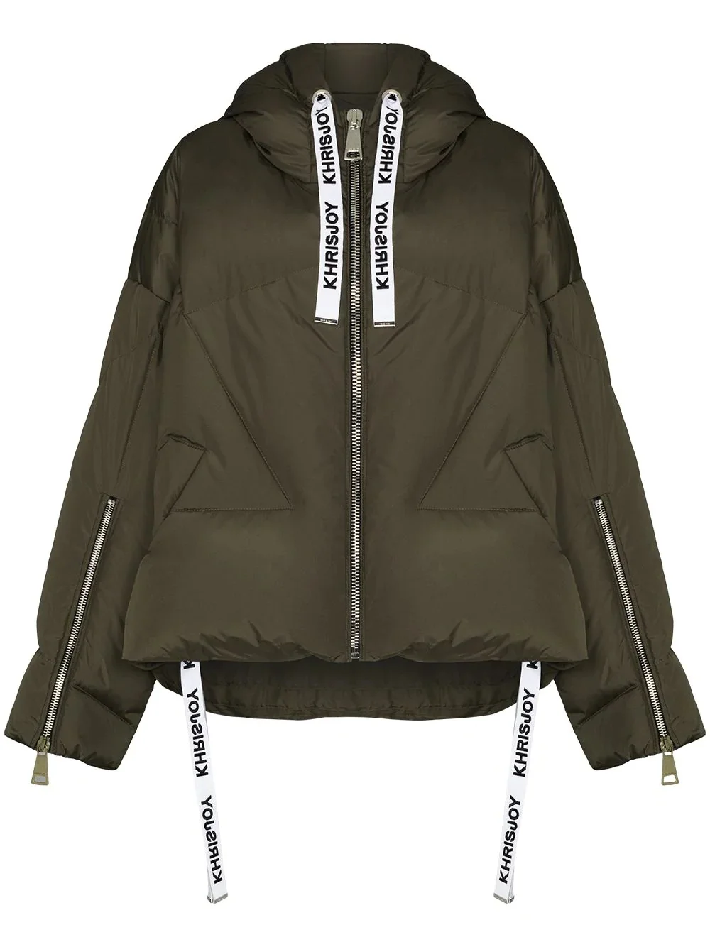 Kris puffer jacket You'll huff, you'll puff...and you'll strut your stuff. But just because this puffer jacket from Khrisjoy looks great on you, that doesn't give you the right to blow down anyone's home. Straw or not. Highlights - Musk green - Padded design - Drawstring hood - Front zip fastening - Long sleeves - Cuff zips Made in Italy Composition Lining: Feather Down 100%, Polyester 100% Outer: Polyester 100% SIZE & FIT Model measurements Height 5 ft 9 in(1.76 m) Bust/Chest 34.25 in(87 cm) Hips 36.22 in(92 cm) Waist 25.19 in(64 cm) FittingInformation This piece fits true to size. We recommend you get your regular size Cut for a loose fit Made with a mid-weight fabric Washing instructions Dry Clean Only