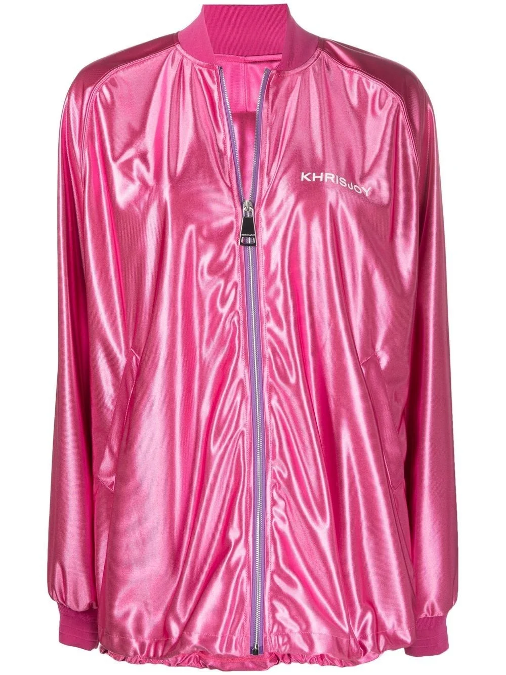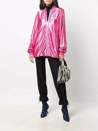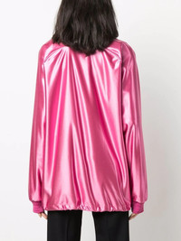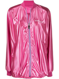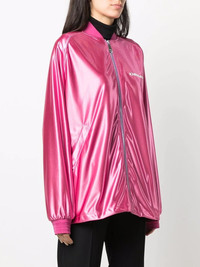 logo-print metallic bomber jacket peony pink high-shine finish metallic effect logo print at the chest front zip fastening baseball collar long sleeves straight hem Made in Italy Composition Outer: Polyester 100% Lining: Polyester 100% SIZE & FIT Model measurements Height 5 ft 10 in(1.79 m) Bust/Chest 33.07 in(84 cm) Hips 35.82 in(91 cm) Waist 24.01 in(61 cm) FittingInformation This piece fits true to size. We recommend you get your regular size Cut for an oversized fit Made with a mid-weight fabric Washing instructions Dry Clean Only