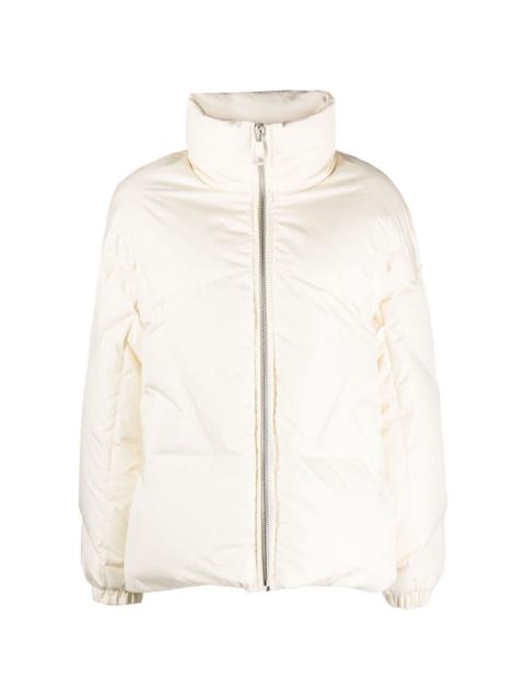 Moon quilted jacket Lined with a plush blend of wool and cashmere for added warmth, this cream iteration of Khrisjoy's Moon puffer jacket is padded with lightweight down. It's fitted with a drawstring hood that offers protection from the elements. Highlights - Cream white - Padded design - Quilted - Funnel neck - Front zip fastening - Drop shoulder - Long sleeves - Elasticated cuffs - Two diagonal pockets to the sides - Wool-cashmere blend lining - High-low hem Made in Italy Composition Lining: Polyester 100%, Feather Down 100%, Polyamide 38%, Wool 29%, Viscose 28%, Cashmere 5% Outer: Polyester 100% SIZE & FIT Model measurements Height 5 ft 10 in(1.78 m) Bust/Chest 31.49 in(80 cm) Hips 35.03 in(89 cm) Waist 23.62 in(60 cm) FittingInformation Designed to be unstructured, offering a loose fit throughout The internal drawstring at the hem allows for fitted preferences Made from a padded non-stretch fabric, giving it no natural elasticity This piece fits true to size – take your usual size Washing instructions Hand Wash