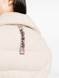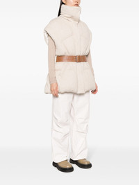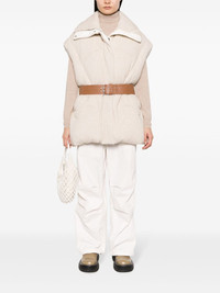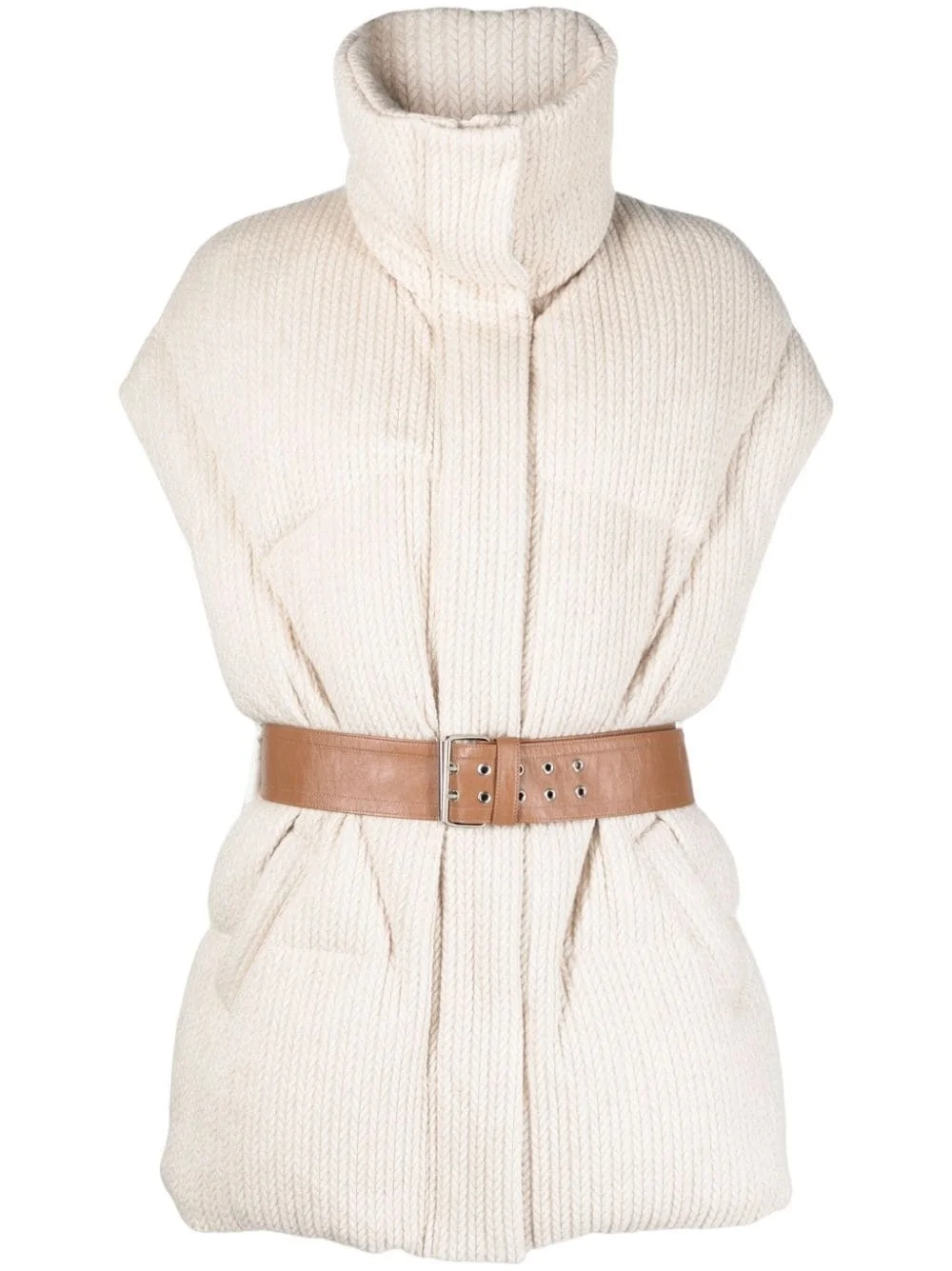 New Iconic knitted gilet Highlights - Light beige - Modal blend - Down-feather filling - Chunky knit - Logo tag - Padded design - Funnel neck - Concealed front fastening - Belted waist - Sleeveless - Straight hem Made in Italy Composition Outer: Modal 60%, Polyester 30%, Polyamide 20% Lining: Feather Down 100%, Polyester 100% SIZE & FIT Model measurements Height 5 ft 10 in(1.78 m) Bust/Chest 30.7 in(78 cm) Hips 36.22 in(92 cm) Waist 25.59 in(65 cm) FittingInformation Designed for an oversized fit, offering additional room throughout The belt offers adjustability for fitted preferences Made from a padded non-stretch fabric, giving it no natural elasticity This piece fits true to size – take your usual size Washing instructions Hand Wash