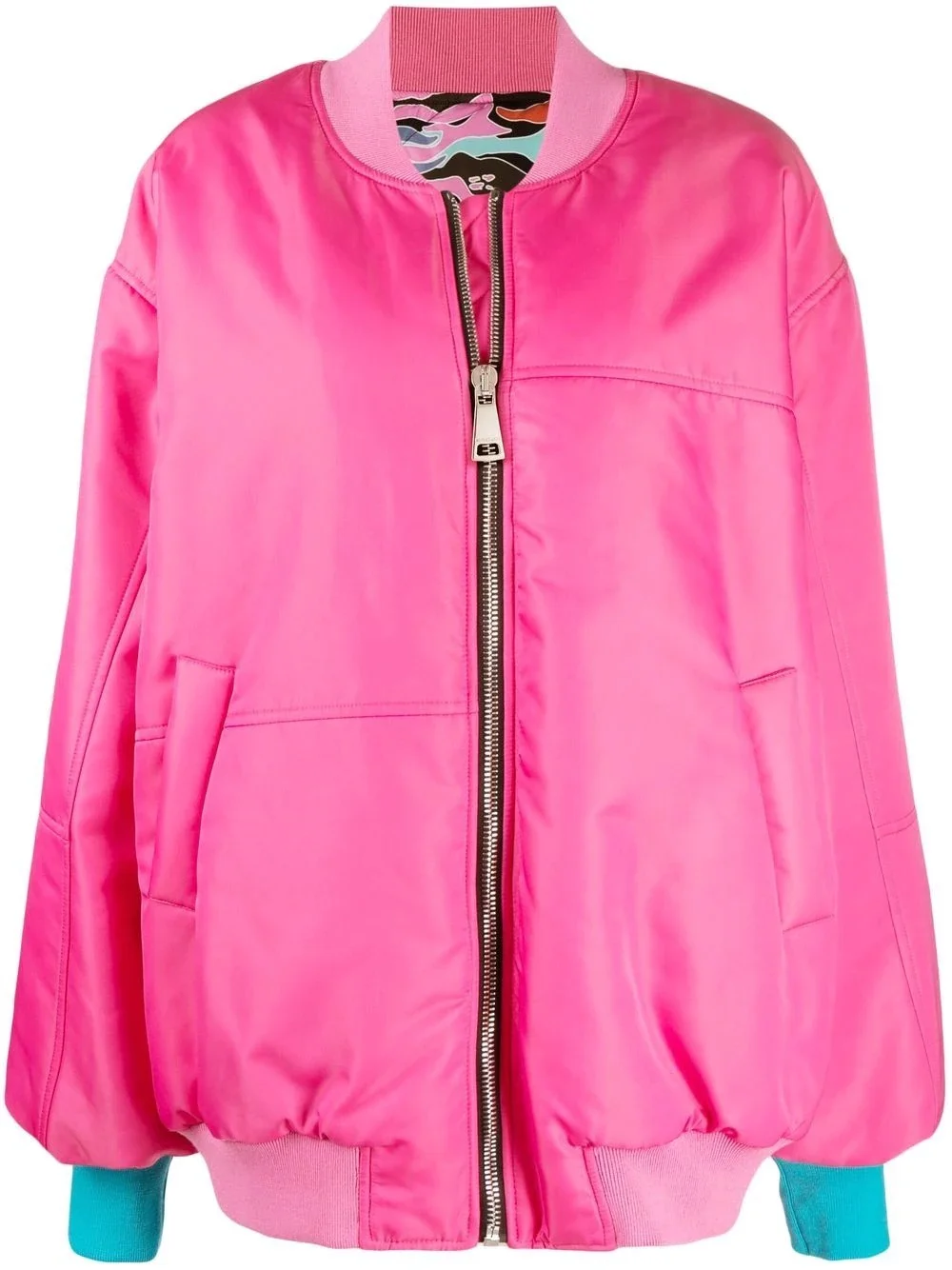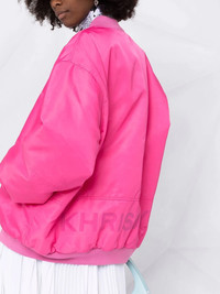 Fuchsia-pink/blue oversized padded jacket from KHRISJOY featuring padded design, two-tone detail, logo print to the rear, baseball collar, front zip fastening, long sleeves, elasticated cuffs, two side inset pockets and elasticated hem. Highlights - Fuchsia-pink/blue - Padded design - Two-tone detail - Logo print to the rear - Baseball collar - Front zip fastening - Long sleeves - Elasticated cuffs - Two side inset pockets - Elasticated hem Made in Italy Composition outer: Polyester 100%,Polyamide 100% lining: Polyester 100%