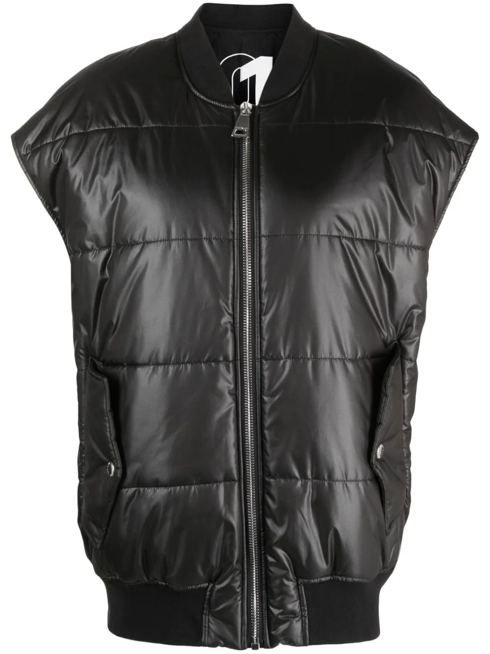 padded bomber vest Highlights - Black - Padded design - Ribbed band collar - Front button and zip fastening - Sleeveless - Two side zip-fastening pockets - Ribbed hem - Straight hem Made in Italy Composition Outer: Polyester 100% Lining: Polyester 100% SIZE & FIT Model measurements Height 5 ft 10 in(1.78 m) Bust/Chest 33.07 in(84 cm) Hips 36.61 in(93 cm) Waist 24.8 in(63 cm) Washing instructions Hand Wash