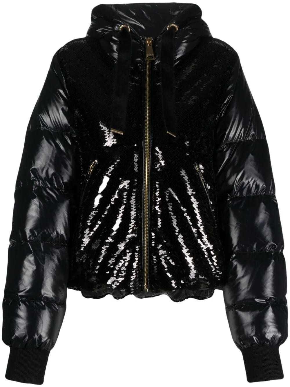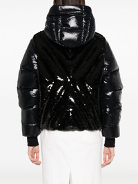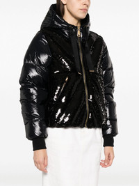 Puff Glossy Sequins hooded jacket Highlights - Core black - Feather down - Glossy finish - Padded design - Sequin detailing - Drawstring hood - Front zip fastening - Long sleeves - Ribbed cuffs - Two side zip-fastening pockets - Straight hem Made in Italy Composition Outer: Polyamide 100%, Polyester 100% Lining: Polyester 100%, Feather Down 100% SIZE & FIT Model measurements Height 5 ft 11 in(1.8 m) Bust/Chest 31.49 in(80 cm) Hips 36.22 in(92 cm) Waist 25.59 in(65 cm) FittingInformation Designed for a relaxed fit, this piece allows for comfort and movement when worn The elasticated hem allows for movement and a comfortable fit Made from a padded non-stretch fabric, giving it no natural elasticity This piece fits true to size – take your usual size Washing instructions Hand Wash