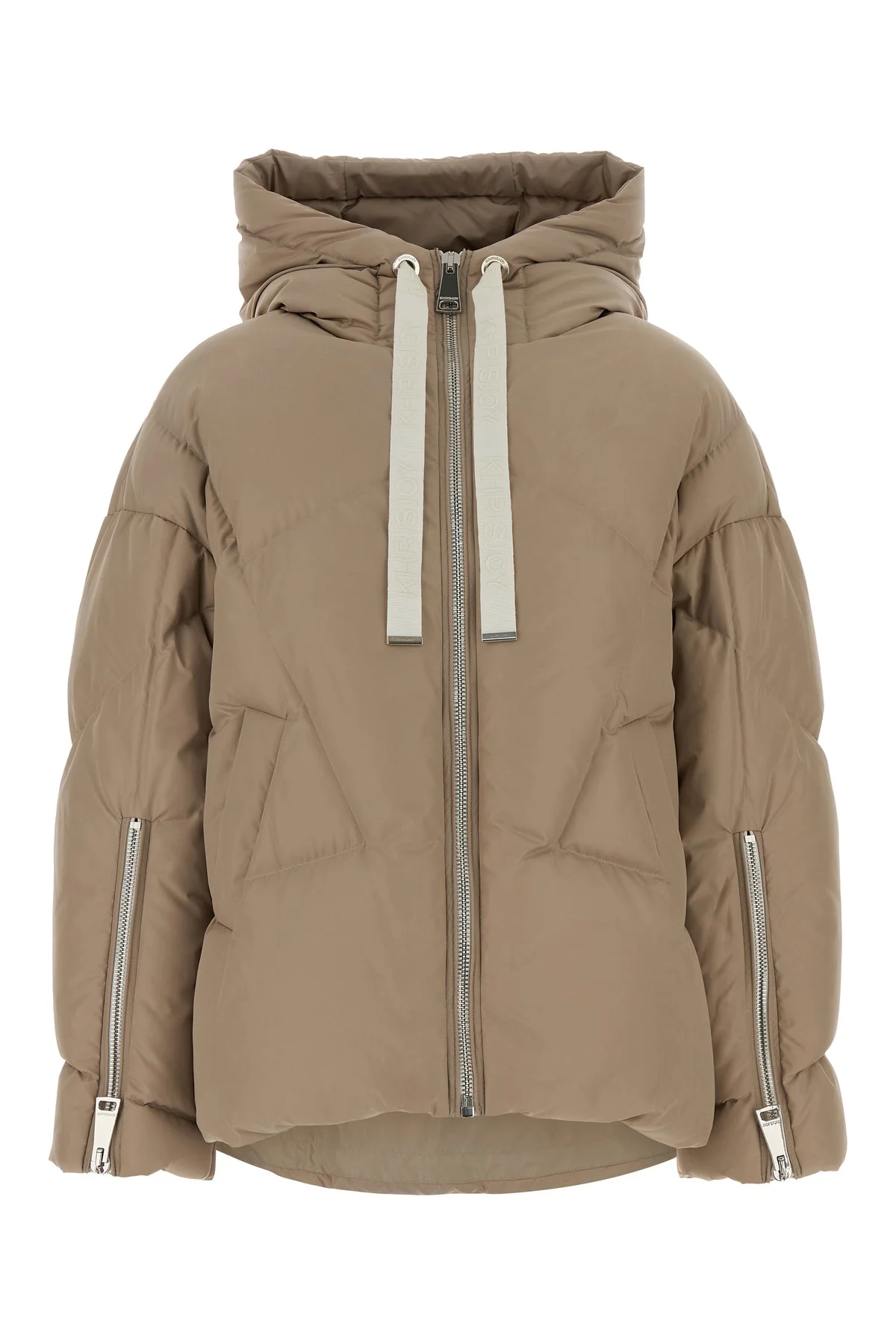 Down jacket realized in quilted polyester blend characterized by logoed drawstring hood. - Zip closure - Two slit pockets at the front - Zipped cuffs - Drawstring on the hemline - Unlined DETAILS Sand polyester blend Milano down jacket Exterior: 86% Polyester 14% Polyurethane Lining: 100% Polyester Padding: 90% Down 10% Feather Made in italy Sample size: 38