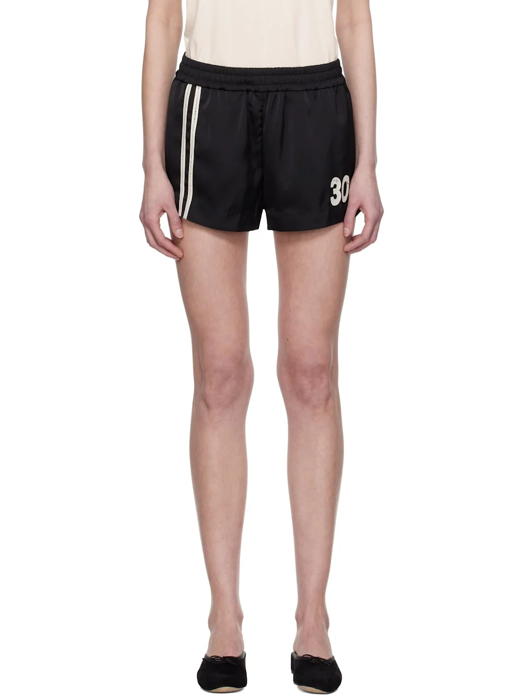 Polyester satin shorts. · Concealed drawstring at elasticized waistband · Three-pocket styling · Stripe appliques at front · Text printed at leg Supplier color: Black 100% polyester. Made in South Korea 251586F088000