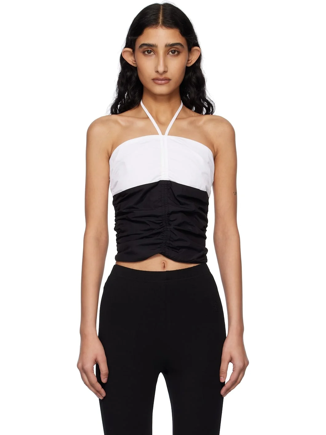 Crinkled nylon taffeta top. Ruching throughout. · Straight neck · Self-tie halter strap · Self-tie fastenings at open back · Fully lined Supplier color: Black/Off-white 100% nylon. Made in South Korea 251586F111007