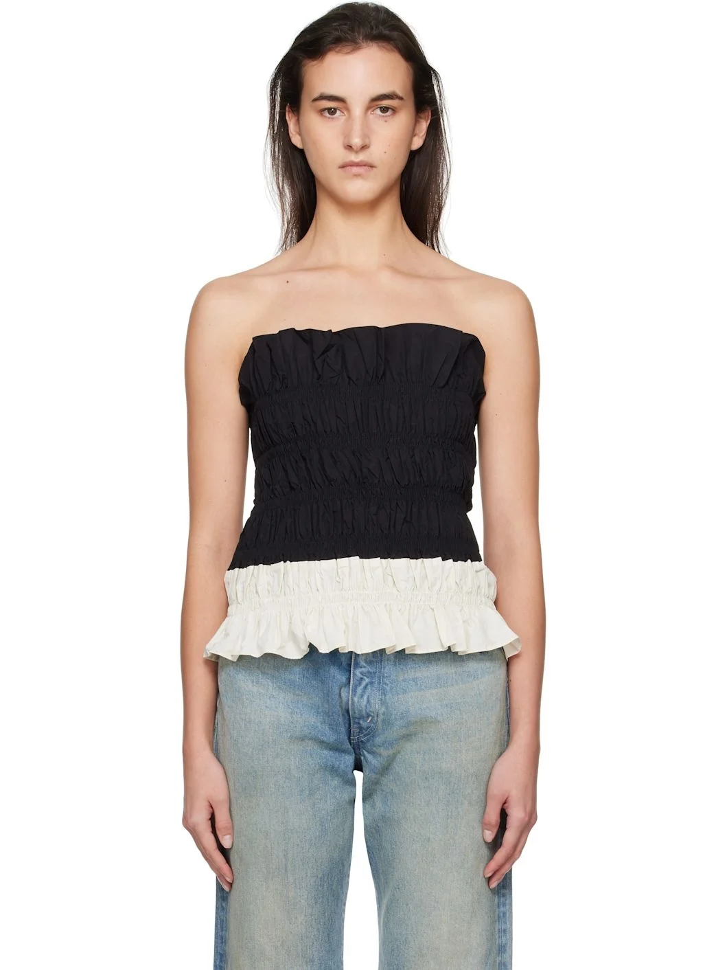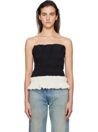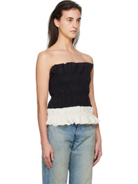 Nylon- and cotton-blend taffeta tube top. Shirring throughout. · Ruffling at straight neck and hem · Self-tie fastening at open back Supplier color: Black/Ivory 70% nylon, 30% cotton. Made in South Korea 251586F111023