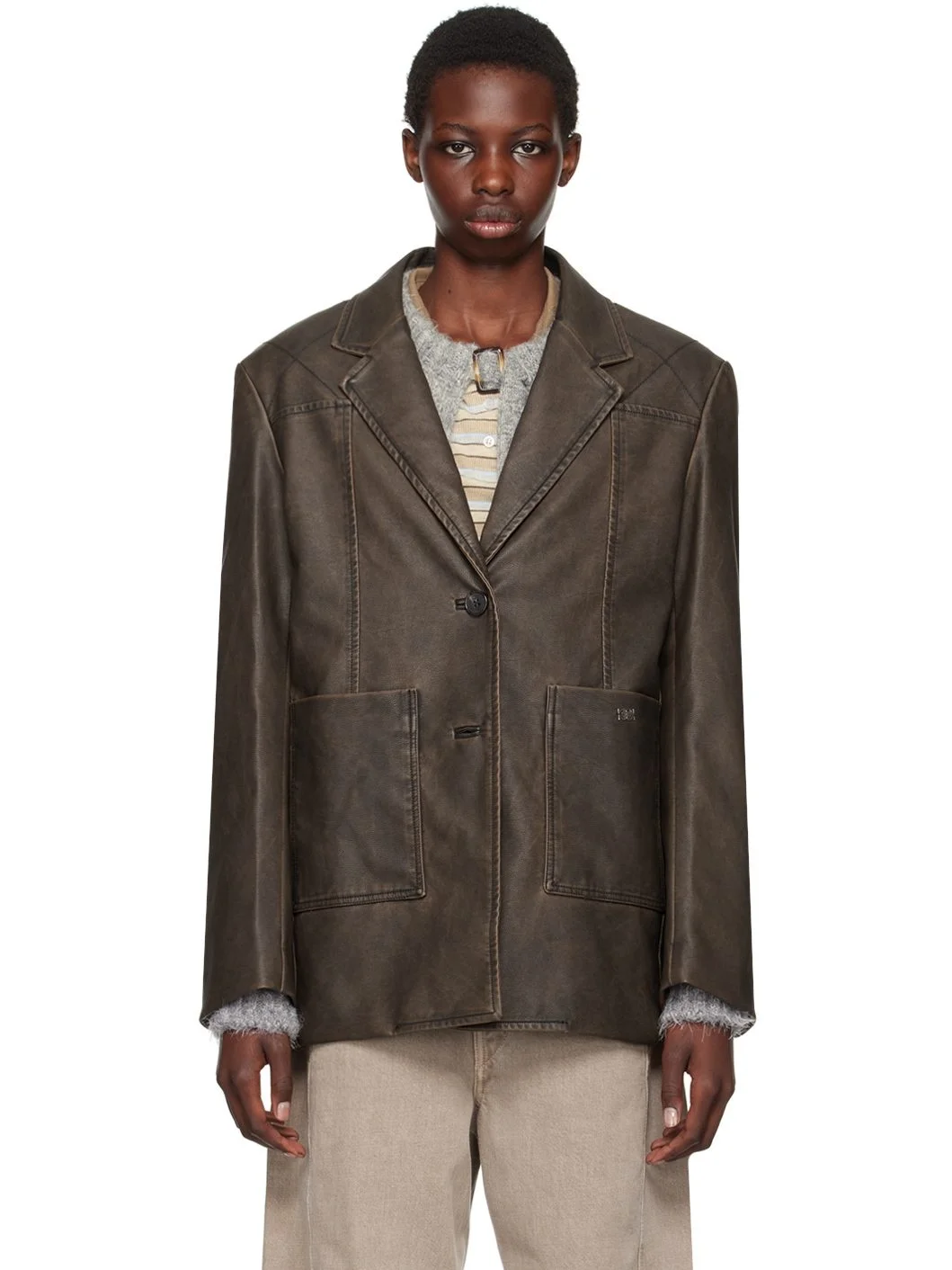 Grained faux-leather blazer. Fading throughout. · Notched lapel · Two-button closure · Logo plaque and patch pockets at front · Stitching at padded shoulders · Four-button surgeon's cuffs · Central vent at back hem · Welt pocket at interior · Full canvas lining Supplier color: Dark brown 65% polyurethane, 35% rayon. Made in South Korea 242586F057000