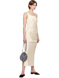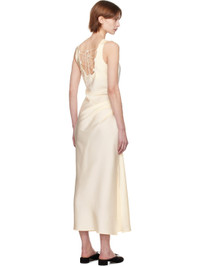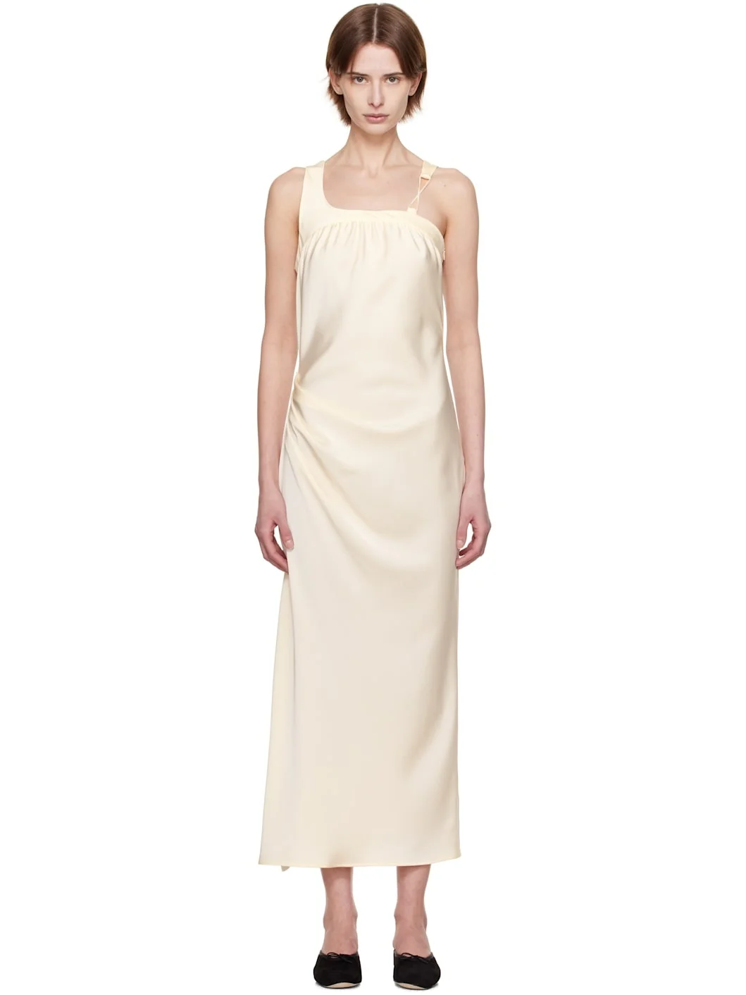 Polyester satin maxi dress. · Gathering at asymmetric neck · Slit at hem · Pleats at side seam · Lace-up detailing at back Supplier color: Ivory 100% polyester. Made in South Korea 251586F055000