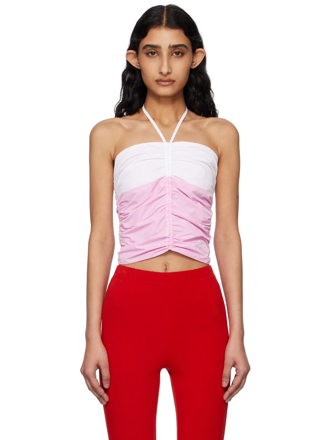 Crinkled nylon taffeta top. Ruching throughout. · Straight neck · Self-tie halter strap · Self-tie fastenings at open back · Fully lined Supplier color: Pink/Off-white 100% nylon. Made in South Korea 251586F111008