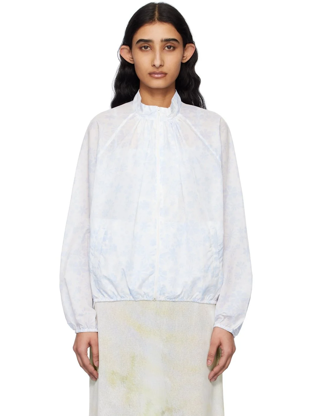 Semi-sheer nylon taffeta jacket. Floral pattern printed throughout. · Embroidered logo at stand collar · Zip closure · Gathering at front and back collar · Welt pockets · Elasticized hem and cuffs · Raglan sleeves Supplier color: Paint sky blue 100% nylon. Made in South Korea 251586F063006