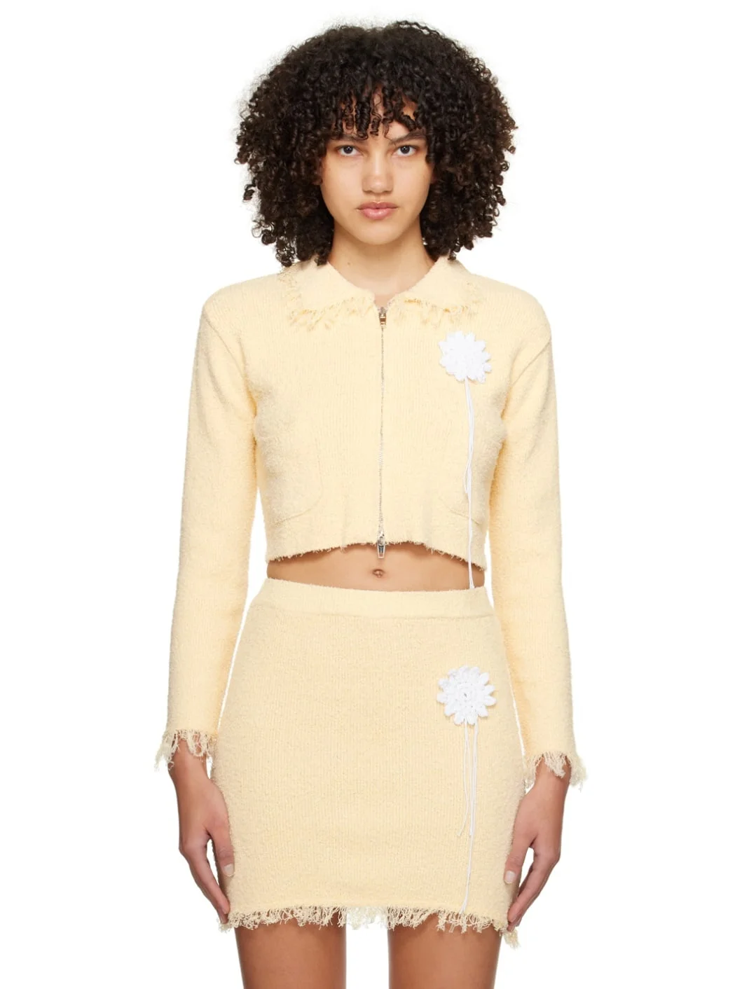 Brushed rib knit cotton-blend sweater. Frayed edges throughout. · Spread collar · Two-way zip closure · Crocheted graphic applique at chest · Patch pockets · Dropped shoulders Supplier color: Yellow 60% cotton, 40% nylon. Made in South Korea 241586F097001