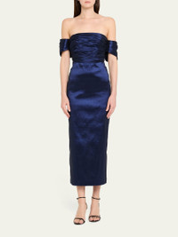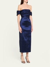 Kika Vargas "Adele" dress constructed of ruched taffeta Approx. 52.7"L from shoulder to hem Off-the-shoulder neckline Short sleeves Center-cut back vent Hem falls below the knee Sheath silhouette Invisible back zipper Polyester/elastane Lining: Elastane/nylon/polyester/taffeta Made in Colombia Online Inquiries: BGS21_T6REJ| Store Inquiries: #5025574