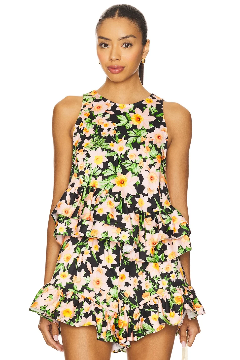 - 97% cotton 3% elastane - Dry clean only - Back button loop closure - Ruffle hem - Cropped design - Midweight floral crepe fabric - Item not sold as a set - Revolve Style No. KVAR-WS2 - Manufacturer Style No. KVTLI147