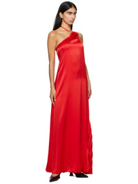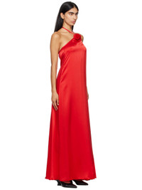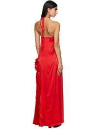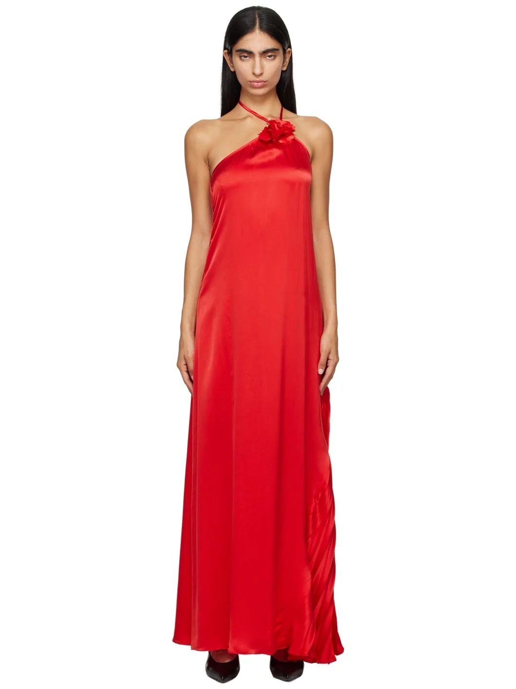 Silk satin dress. · Floral applique at halter neck and side · Pleats at side · Self-tie halter strap · Concealed zip closure at back · Unlined Supplier color: Red 100% silk. Made in Colombia 242593F055000