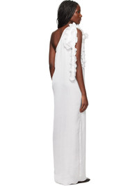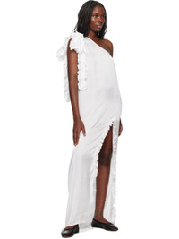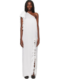 Stretch polyester satin maxi dress. Ruffles throughout. · Single-shoulder construction · Slit at front · Zip closure at side seam · Integrated scarf-style trim at shoulder Available exclusively at SSENSE. Supplier color: White 97% polyester, 3% elastane. Made in Colombia 251593F055005
