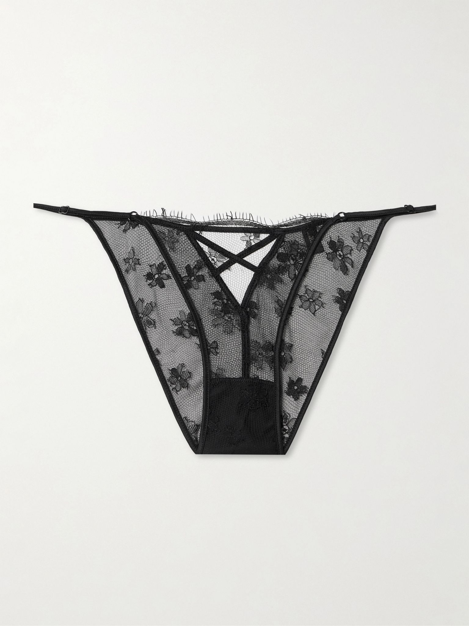 Kiki de Montparnasse's briefs looks so delicate thanks to the shape and floral lace. Set on satin straps, they're hand-cut with scalloped, eyelash-trimmed edges. Size & Fit - Fits true to size, take your normal size - Low-rise briefs with minimal coverage - Model is 175cm/ 5'9" and is wearing a size Small Details & Care - Black lace and satin - Lined at base - 65% polyester, 35% rayon
