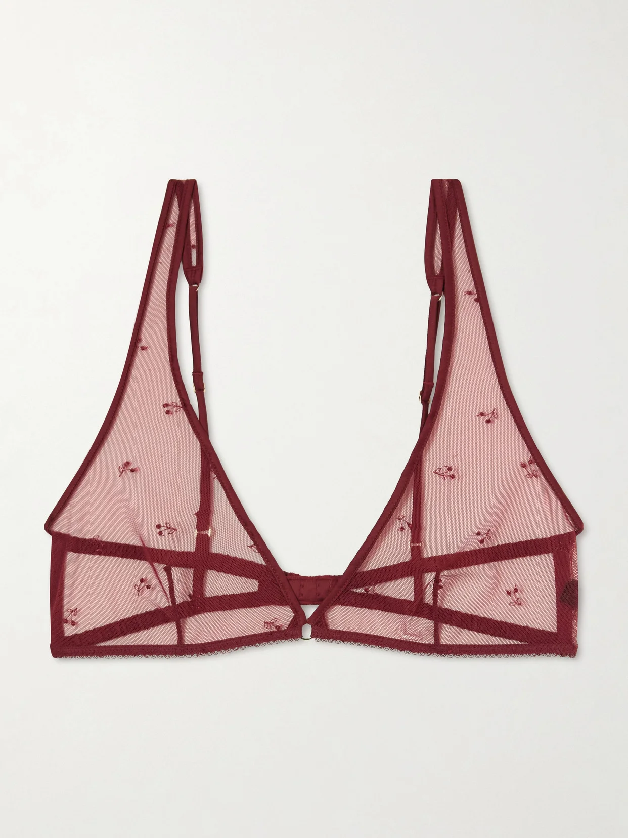 Kiki de Montparnasse's 'Cerise' embroidered mesh bra is defined by sheer panels traced with delicate cherry motifs. A soft scoop neckline and fine straps shape the silhouette, balancing transparency and ornament with the label's Parisian-inspired approach to intimacy.