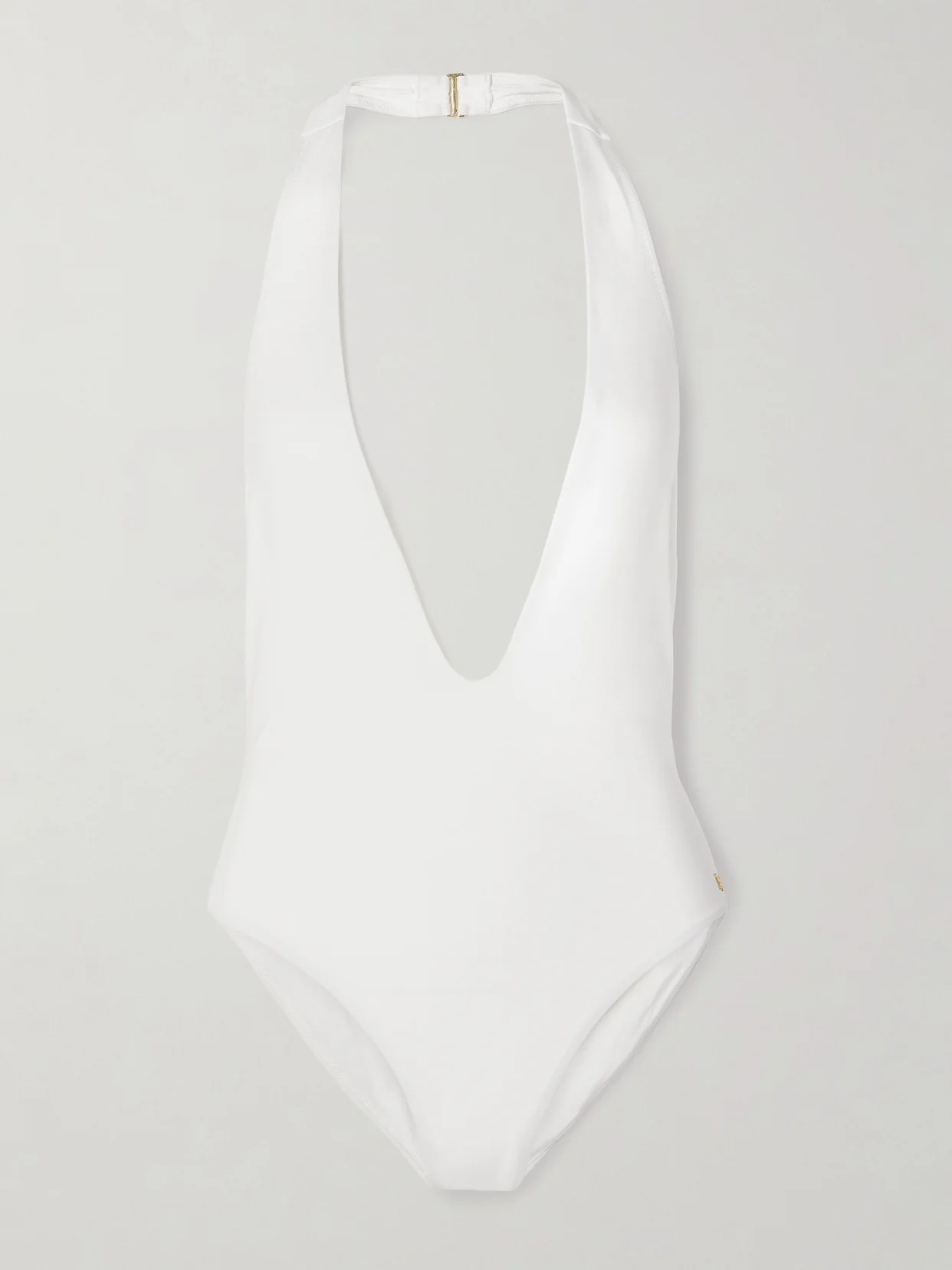 Strikingly simple, Kiki de Montparnasse 'Echauffe' swimsuit will look so chic by the pool. It's crafted from white stretch fabric with a super low neckline, halterneck straps and open back. Style yours with dark shades and gold jewelry.